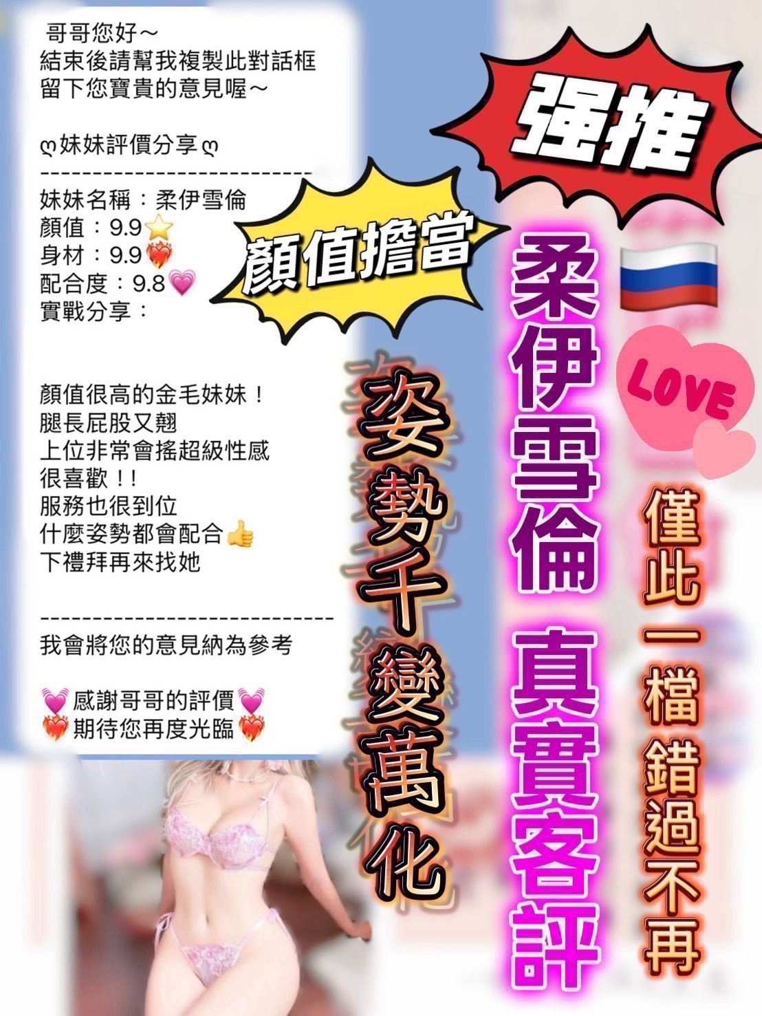 主打➡️俄羅斯純帝國血統,嬌柔嫵媚妖嬈身姿,究極火辣辣身材彰顯尤物的高貴女神,堅挺天然雙峰,渾圓美尻,堪比真人芭比,每每出擊吸引大批粉絲愛戴,我保證絕對不會讓你失望、真的天數不多,回客不斷,再不來就來不及啦啦啦啦!