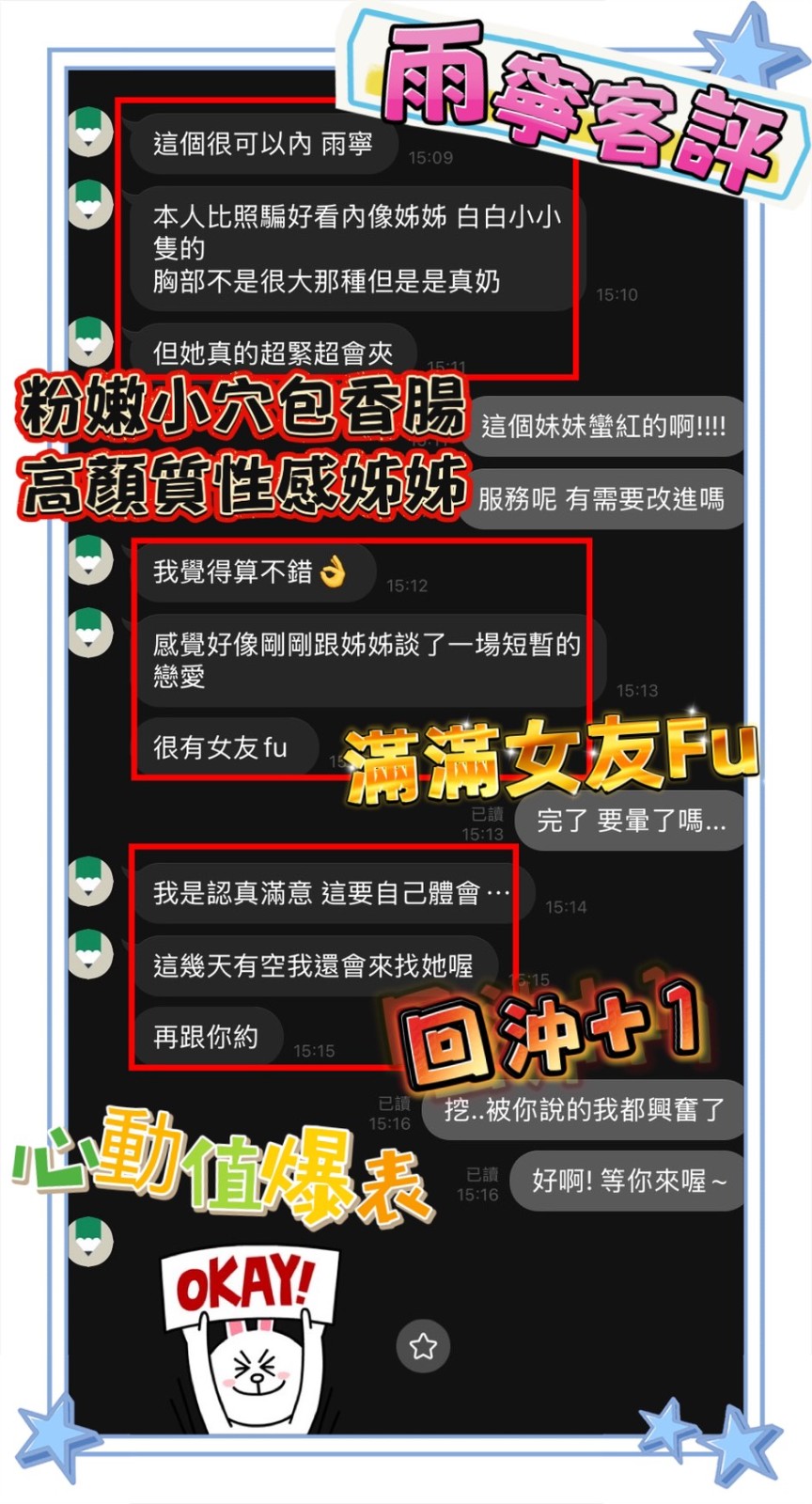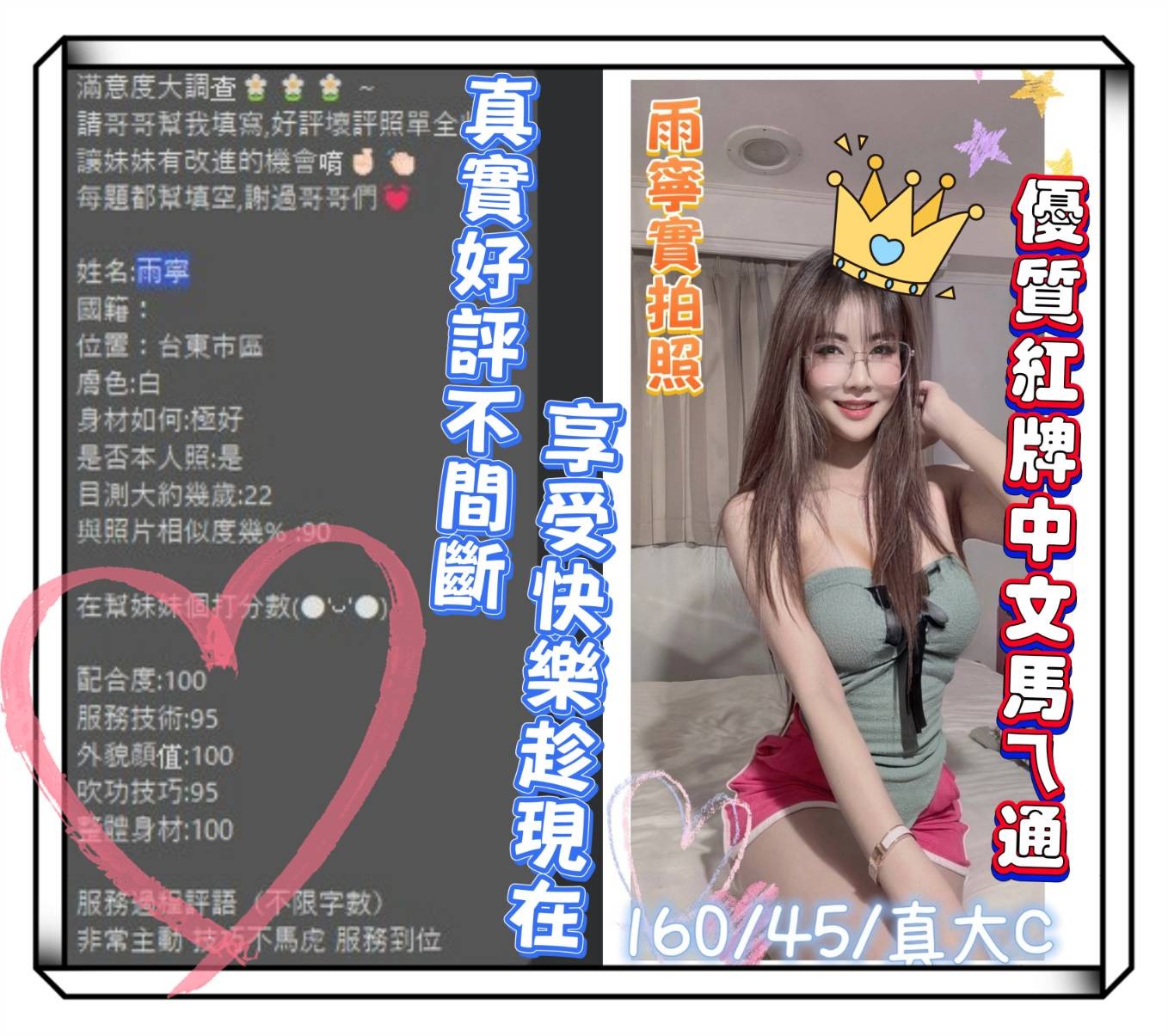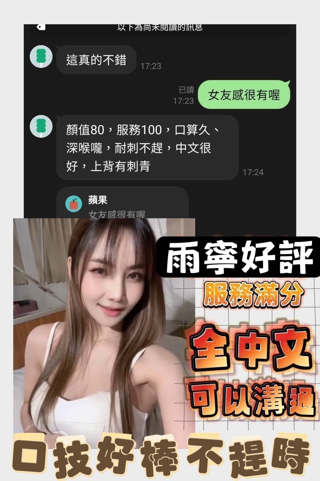 無套吹/小親親/舌吻/69/品鮑/舔蛋/奶炮/胸推/屁推/甜蜜共浴/按摩/水中蕭/深喉嚨/絲襪(需自備)/角色扮演(需自備)